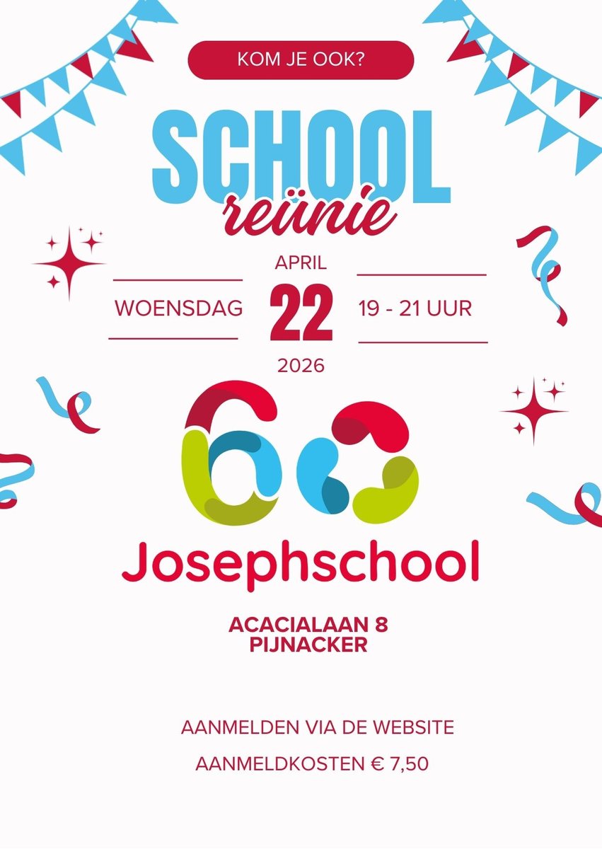 Woensdagavond 22 april 2026 van 19 uur tot 21 uur zijn alle voor oud-leerlingen en oud-leerkrachten uitgenodigd voor deze reünie. Aanmelden kan tot en met vrijdag 20 maart 2026 via onderstaande website. Aanmeldkosten €7,50.